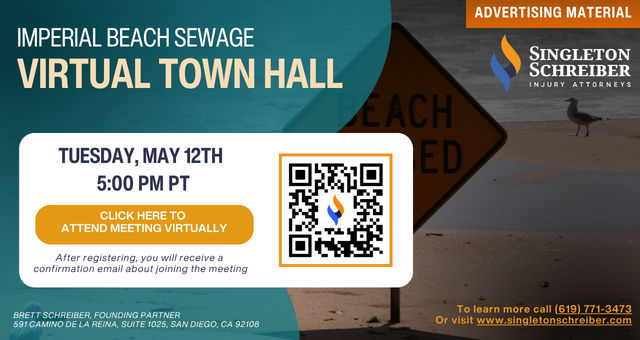 Join some of Singleton Schreiber's local attorneys for a virtual Imperial Beach Sewage Spill town hall on Tuesday, May 12th, 2026, at 5:00 PM PT.