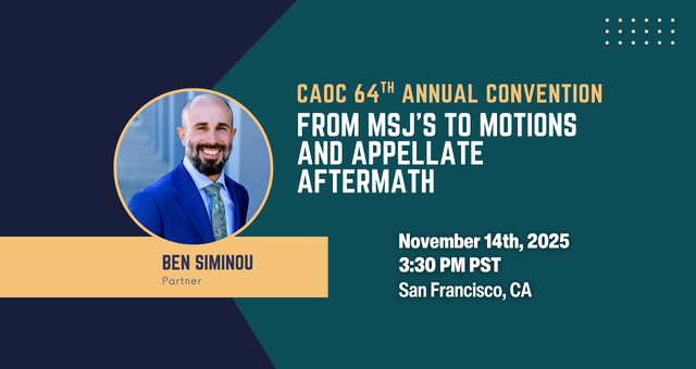 Join Ben Siminou at the CAOC 64th Annual Convention, where he will be a panelist on the session “From MSJs to Motions and Appellate Aftermath” on Friday, November 14th, from 3:30 PM to 5:00 PM (PT).