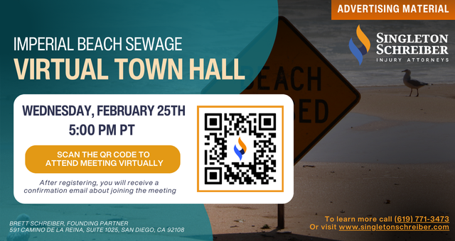 Join some of Singleton Schreiber's local attorneys for a virtual Imperial Beach Sewage Spill town hall on Wednesday, February 25th, 2026, at 5:00 PM PT.